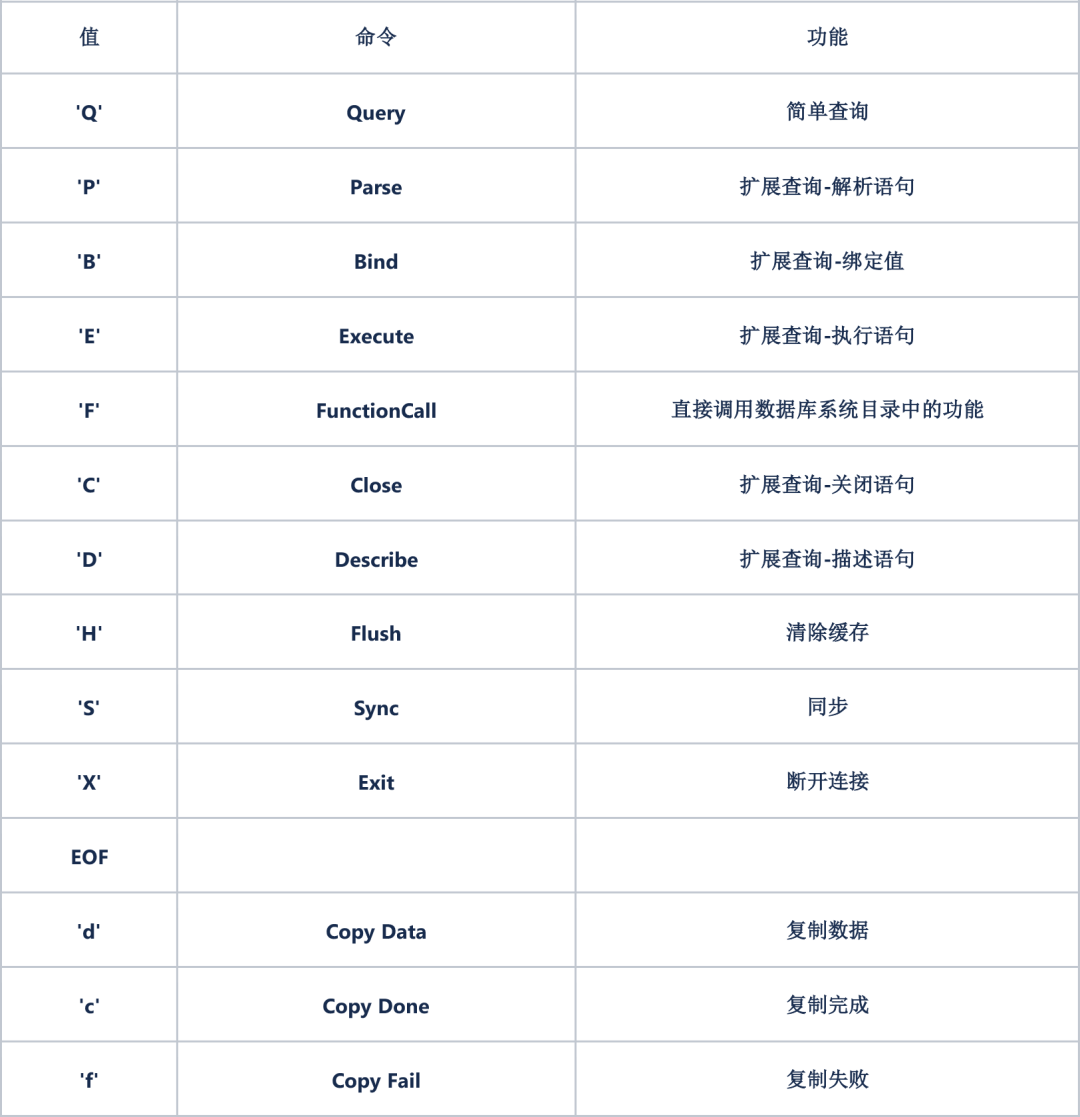 2. 在命令类型,也就是cmd指令上,MySQL是一个16进制的整数数来判断是哪一种命令,而PostgreSQL是以一个char字符来判断命令类型的。