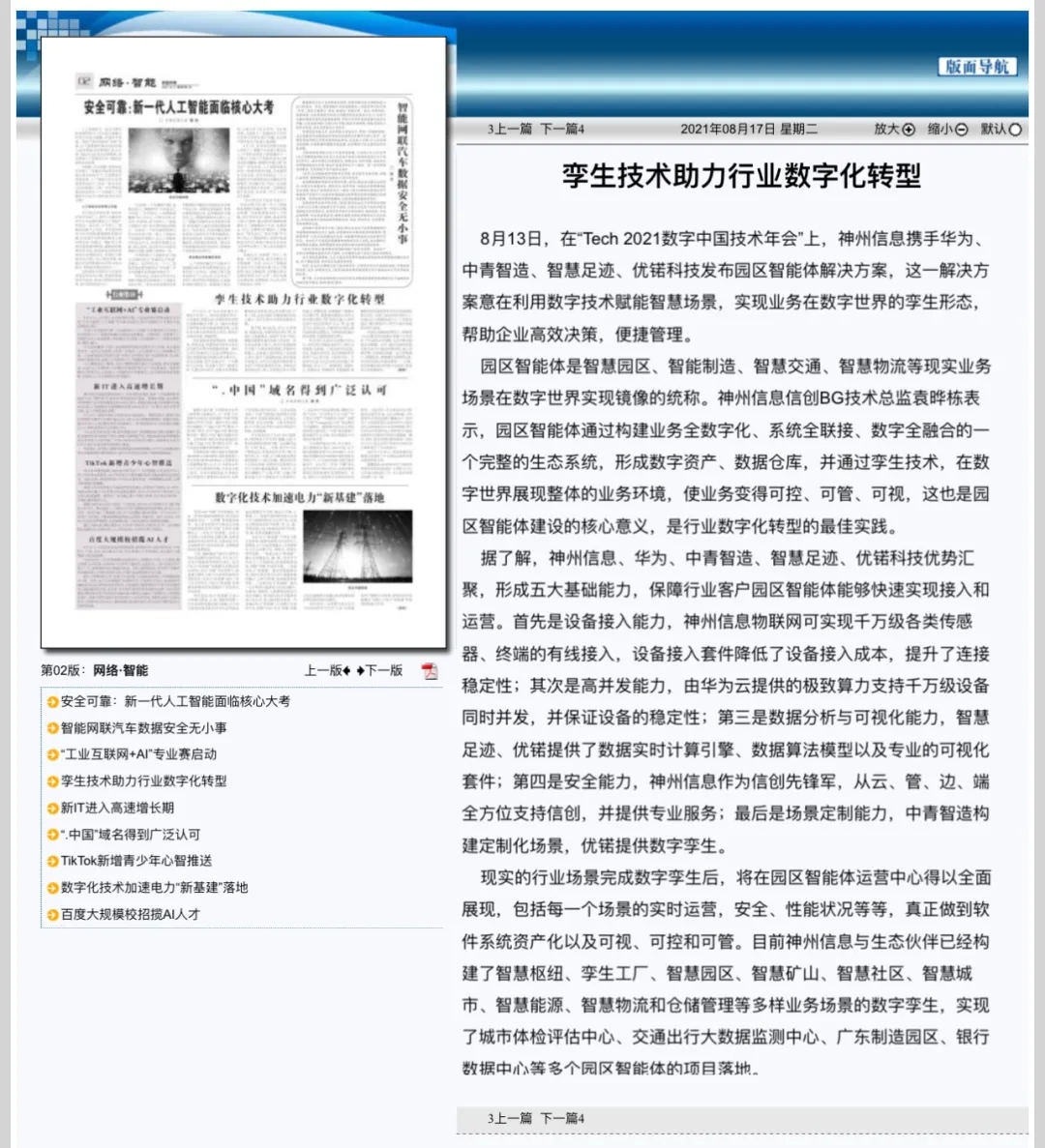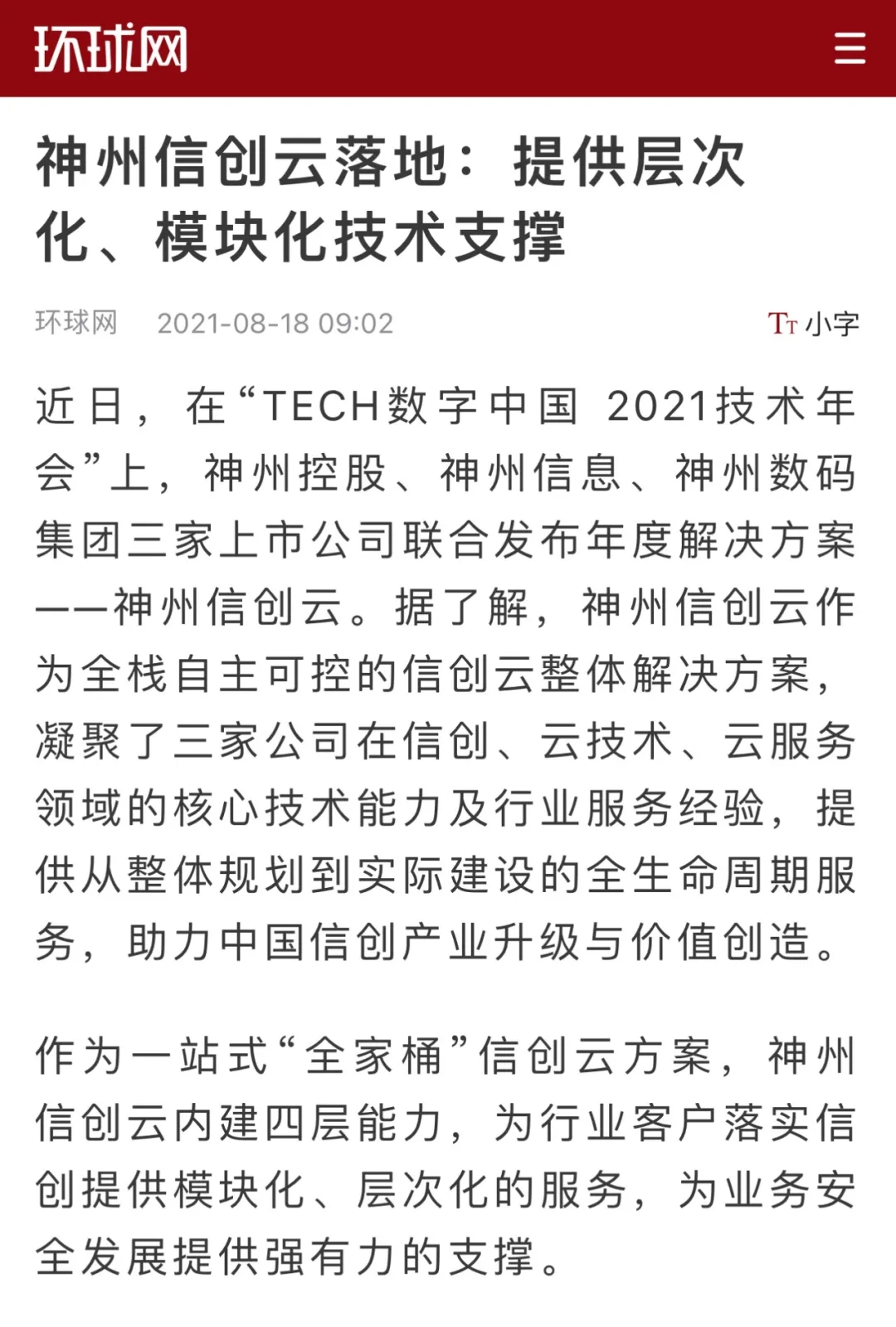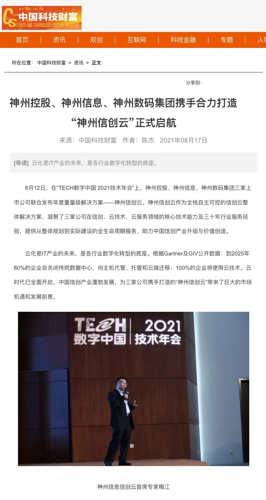 8月12日,由神州控股、神州信息、710公海寰宇集团联合主办的“科技自强、数据融通、场景创新——TECH数字中国 2021技术年会”云上盛大启幕,发布神州信创云、ModelB@nk5.0、金融超脑Sm@rtFSB、云原生数字化安全底座、园区智能体等重磅产品,国内各大权威、影响力媒体多角度多频次对盛况进行报道!